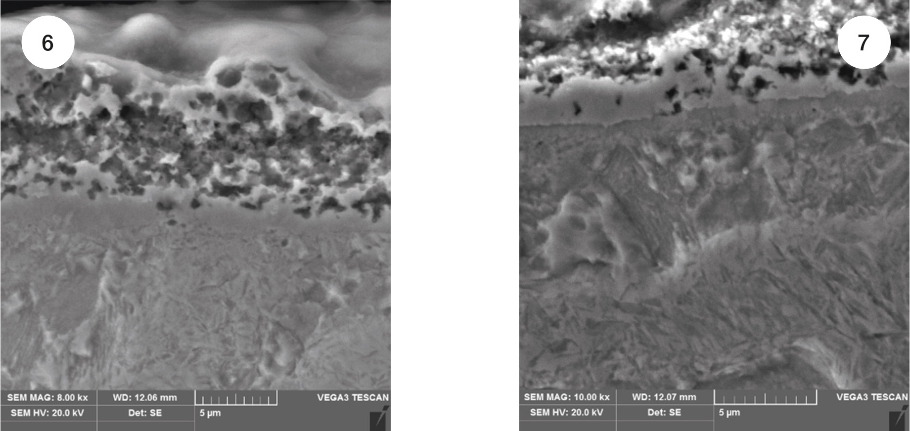 Zoals te zien is in Beeld 6 en Beeld 7, veroorzaakt de werking van de boog dat de nitriden uiteenvallen en een poreus, beschadigd oppervlak vormen.